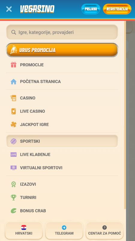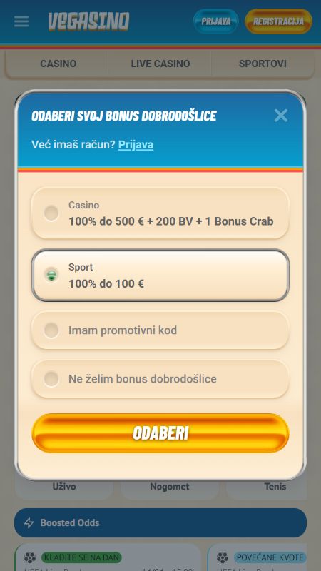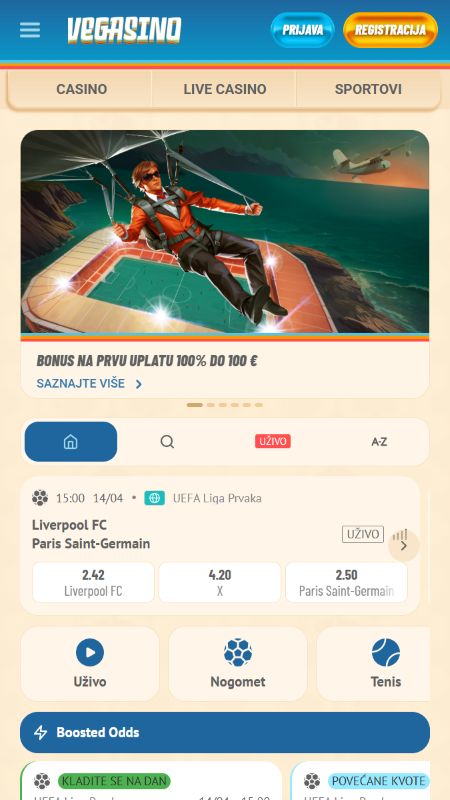 Vegasino kladionica je modernog i preglednog dizajna, stoga ćeš se brzo snaći, čak i ako prvi put koristiš platformu. Stranica je jasno podijeljena – s lijeve strane nalazi se izbornik sa sportovima i ligama, dok se u sredini prikazuju aktualni događaji, kvote i istaknute ponude poput „boosted odds”. To ti omogućuje da odmah vidiš najvažnije oklade bez dodatnog traženja