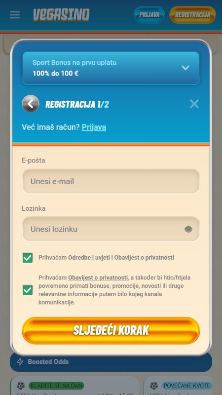 Ako se želite kladiti na Vegasino platformi, prvo morate otvoriti korisnički račun. Proces registracije je jednostavan i sastoji se od nekoliko brzih koraka:
