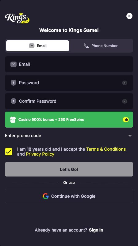 Registracija na Kings.Game ide brzo i bez nepotrebnih komplikacija. Nema dugih formi niti previše koraka, što znači da nalog možete otvoriti za par minuta.